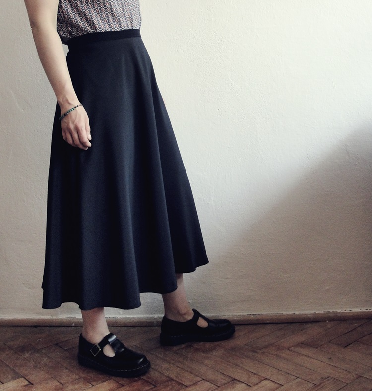 Uszyta z cieniutkiej krepy (chyba, zakup secondhandowy bez metki), jest jak mgiełka. Pod spodem ma halkę, więc nic nie prześwituje. No i się nie gniecie! Będę ją nosić z dzianinowymi topami oraz cienkimi bluzkami i koszulami (wciąż mam zamiar je szyć i mocno myślę nad kolejnym krokiem). Do sandałków pasuje cudownie i zakrywa moje biedne, wiecznie nieopalone i poobijane nogi. Nie będę się tu rozpisywać więcej, bo uszycie takiej spódnicy jest proste jak but, połowa koła + pasek, tyle.