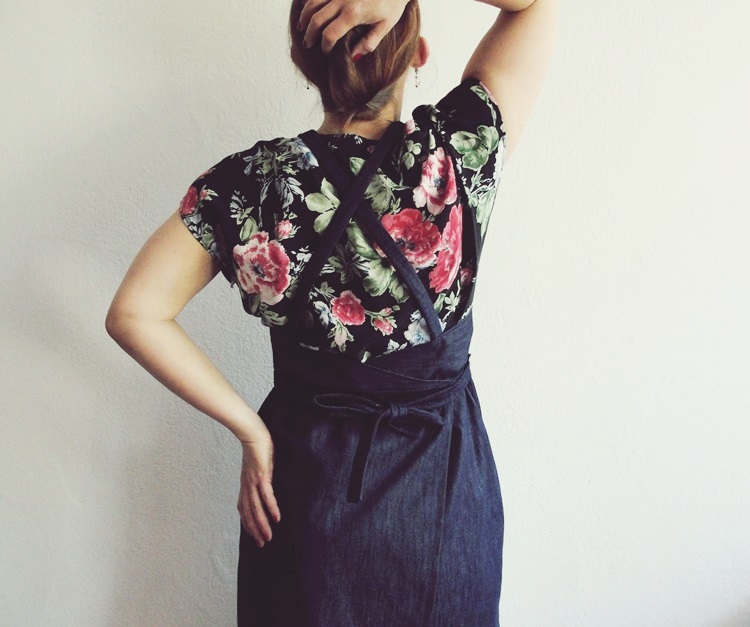 Szycie poszło dość gładko, najwięcej czasu zajęły mi dumania nad detalami: grubością pasków, dodatkową szlufką (dzięki niej spódnica lepiej się trzyma, no i można ją wiązać do przodu i do tyłu), mocowaniem zapięcia, krzyż na plecach itd. Wahałam się, czy robić ozdobne – typowe dla jeansu – pomarańczowe stębnowanie. Postanowiłam jednak zachować możliwie minimalistyczny wygląd sukienki. Szelki po prostu doszyłam, zrezygnowałam z regulacji. Pasek zawija się tylko raz, bo nie lubię aż tak się obwiązywać. Zrezygnowałam też z kieszonki. Efekt widzicie na załączonych zdjęciach. Oceńcie same.