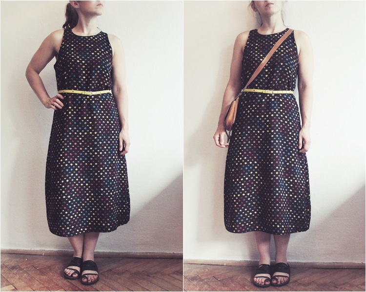 Skroiłam, zszyłam i stwierdziłam, że jest cudownie. Przed lustrem w moim ciemnym przedpokoju ta nieco dziwaczna tkanina zaczęła się prezentować niezwykle intrygująco, wzór ciekawie falował, a całość byłam lekka jak piórko. No ale potem dodałam podkroje, podszewkę i zrobiło się ciężej. Znikł gdzieś urok halki. Wciąż mi się podobało, nawet zabrałam kieckę na jazdę próbną. Nosiło mi się ją przecudnie. A potem zrobiłam fotki i stwierdziłam: NIE. Nie to, żeby było tragicznie, ale to, co ten krój i wzór robi z moją sylwetką, po prostu mi się nie podoba. Pewnie pomogłoby skrócenie, ale sęk w tym, że zależało mi na długości midi. Jadąc tramwajem do pracy, rozmyślałam, jak to uratować. Talia, podszewka tylko pod spódnicą (będzie lżej), wykończenie dekoltu i paszek lamówką. Może kiedyś!? Chwilowo wystarczy mi żółty pasek w talii.