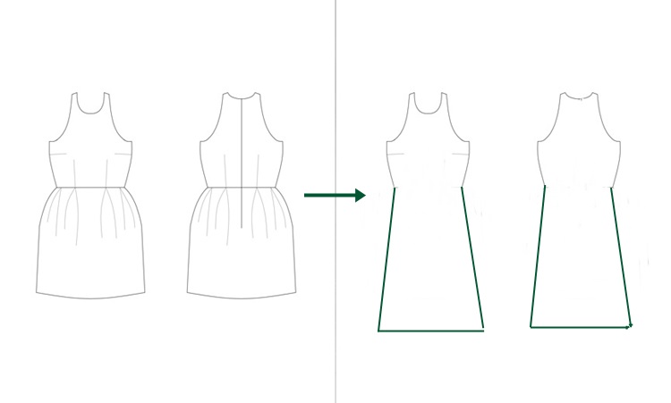 Dla tych, którym jednak spodobała się idea takiej kiecki, kilka słów o wykroju. Jak już wspominałam, sukienkę oparłam o darmowy wykrój Sonja dress. Uwielbiam ten model za ładną, głęboką linię ramion i nieeksponowany dekolt. Korzystałam z góry już dostosowanej do mojej sylwetki, wykrój został mi po tym projekcie. Zlikwidowałam zakładki formujące przy talii, odrzuciłam dół, w zamian przedłużyłam górę, prowadząc linie w kształt A. Planowałam dodać suwak z boku, ale okazało się, że sukienka wchodzi przez głowę, więc sobie darowałam. Uwaga! Otwór na głowę jest dość mały, oryginalnie sukienka ma suwak z tyłu, więc warto to wziąć pod uwagę przy ewentualnym szyciu. Oczywiście w ten sposób można przerobić wiele innych modeli.