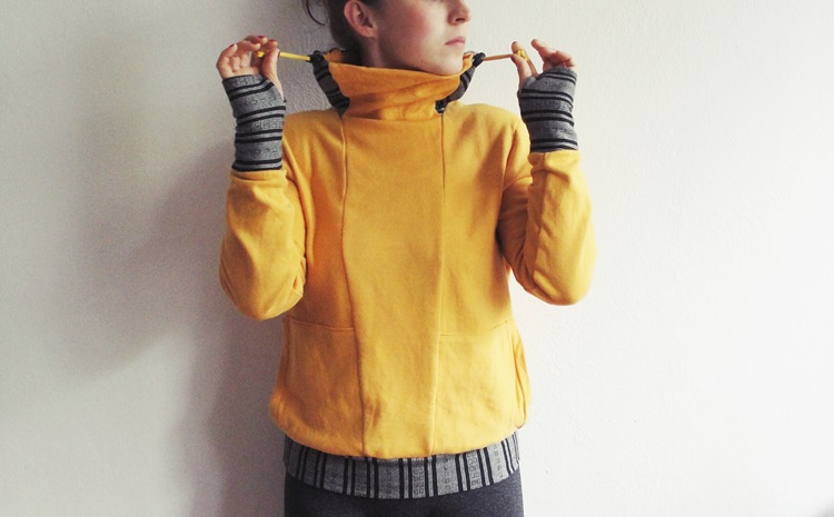 Ostatnio zrobiłam wielkie czystki w szafie. Szczególnie półka ubrań sportowo-komfortowych została przetrzebiona. Wszystkie stare, zmechacone bluzy poszły do śmietnika. W końcu umiem uszyć coś fajnego, a i kilka odpowiednich tkanin od dawna zalegało w szafie. Żółtą dresówkę kupiłam z myślą o Lubym – „uszyj mi jaskrawe ubrania w skały, ładnie wyglądają na zdjęciach”. No ale potem stwierdził, że żółty to przesada. Ogólnie nie jestem wielką fanką szycia ubrań po domu, do lasu itd. Wolę doniszczać stare, ale po tym, jak uszyłam tę bluzę, zrozumiałam, że czas na zmianę podejścia. Szczególnie, że zapas staroci mocno mi się skurczył jednak, a zapas dresówek wcale.